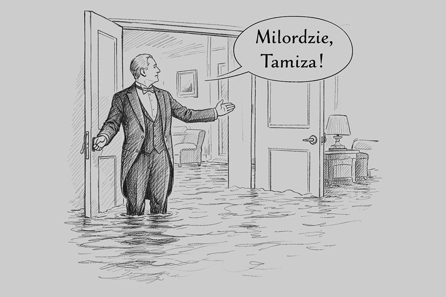 powódź. Kamerdyner otwiera drzwi i już po